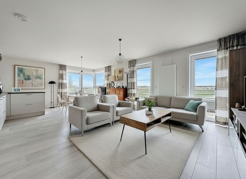 Hall d'entrée / hall de nuit, spacieux séjour baigné de lumière avec orientation sud-ouest, cuisine ouverte entièrement équipée, terrasse agréable, buanderie / chaufferie, WC séparé, salle de douche avec raccordements machines, 2 chambres.